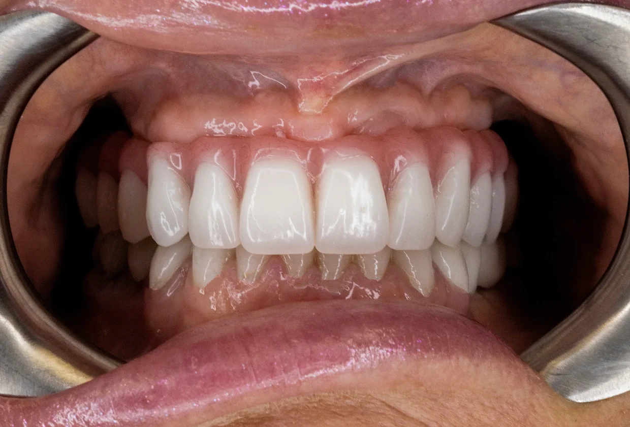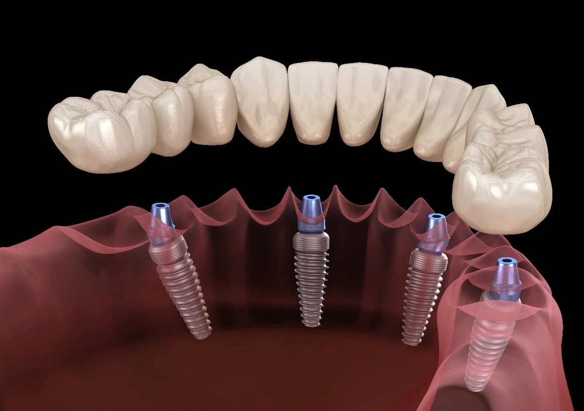 Instead of placing an implant for every missing tooth, we place a small number of implants in precise positions that maximize bone support. These implants hold a full arch of teeth securely in place.